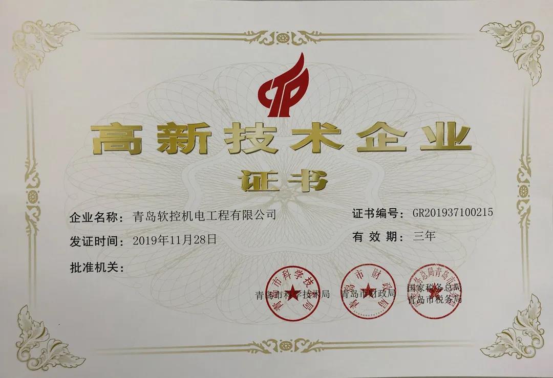 近日,青島軟控機電工程有限公司榮獲青島市科學技術局、青島市財政局、國家稅務總局青島市稅務局聯合下發的《高新技術企業證書》,這是繼2016年初次獲評后,軟控再次獲此殊榮。